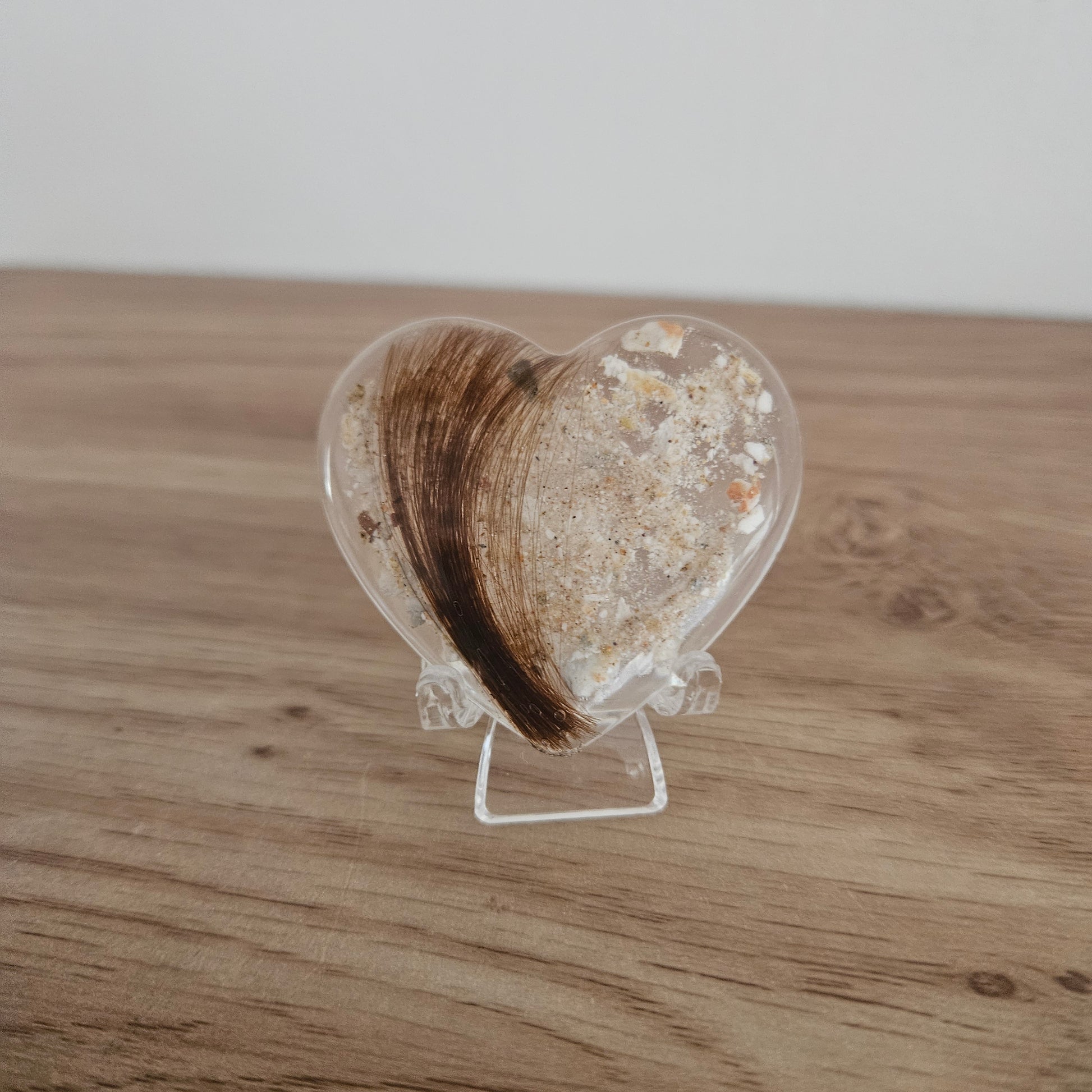 Ons handgemaakte Epoxy Herinneringshart (ca. 4,5 x 5 x 0,5 cm) wordt speciaal voor jou gemaakt en kan zowel as als haar of een combinatie daarvan bevatten. Zo ontstaat een blijvende en tastbare herinnering aan jouw dierbare.