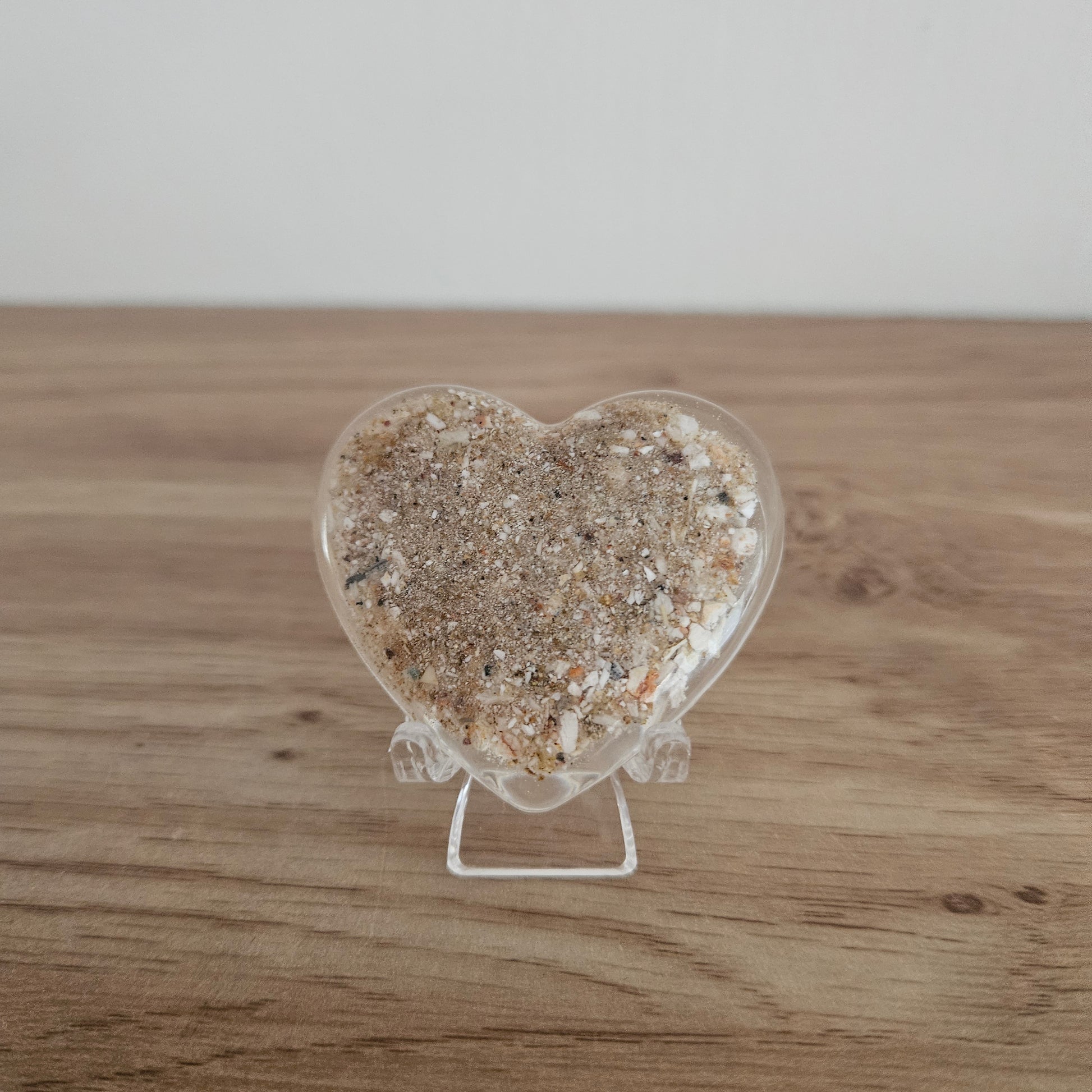 Voor een volledig epoxy herinneringsstukje gebruiken wij bij voorkeur voldoende as (bij een hartje minimaal 20 gram, ca. 1 grote eetlepel). Is er minder as beschikbaar? Dan kunnen we in overleg het epoxy herinneringsstukje aanvullen met schelpenzand. Dit is optioneel en zorgt ervoor dat ook met een kleinere hoeveelheid as een epoxy herinneringsstukje gemaakt kan worden.