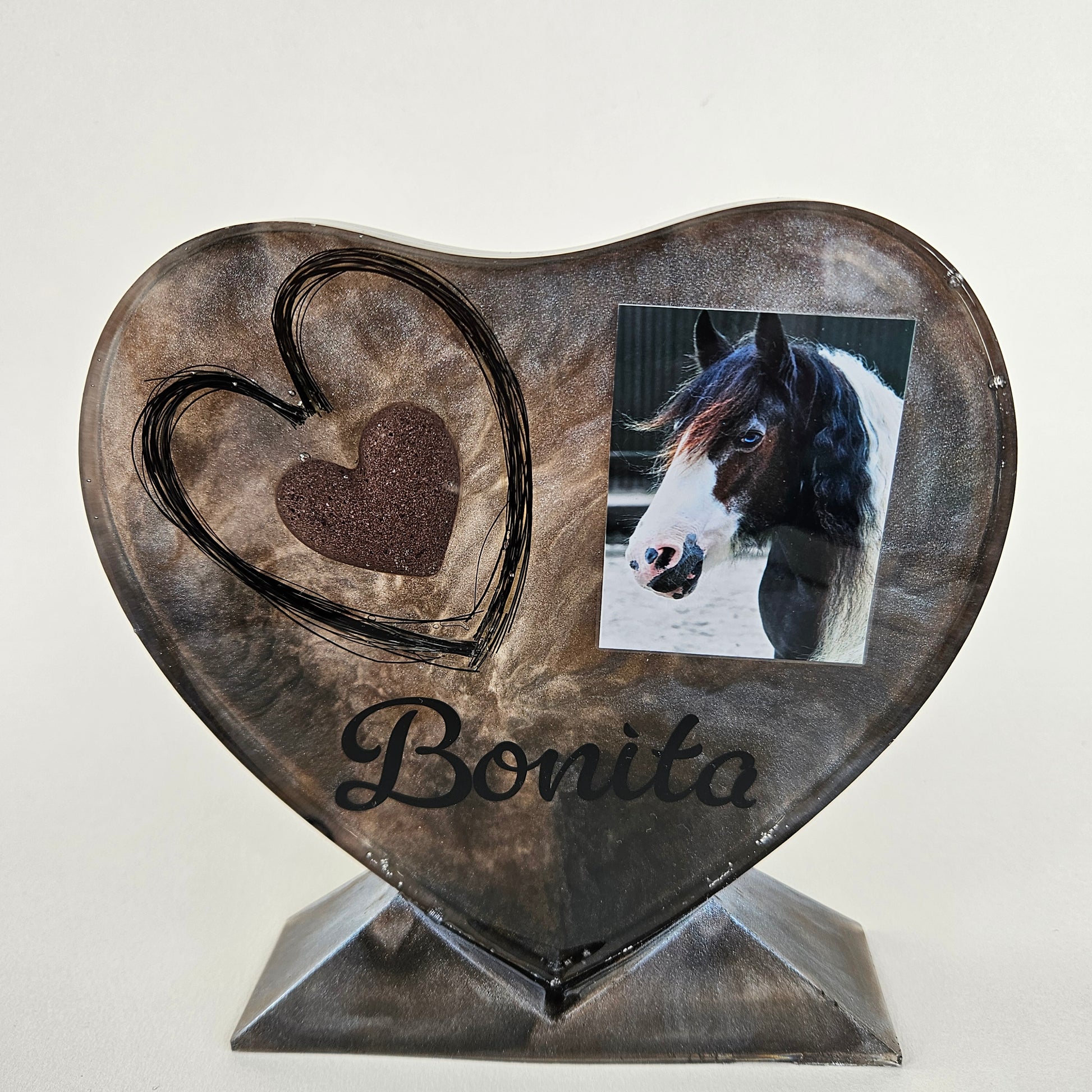 Ons handgemaakte Epoxy Herinneringshart staand M (ca 17.5 x 15 x 1 cm) wordt speciaal voor jou gemaakt en kan zowel as als haar of een combinatie daarvan bevatten. Zo ontstaat een blijvende en tastbare herinnering aan jouw dierbare.